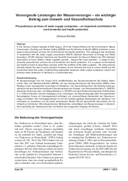 Im Bundesanzeiger vom 28. August 2014 veröffentlichten das Bundesministerium für Umwelt, Naturschutz, Bau und Reaktorsicherheit (BMUB) und das Bundesministerium für Gesundheit (BMG) einen Katalog zu den vorsorgenden Leistungen im Gewässer- und Gesundheitsschutz. Der Katalog wurde gemeinsam mit den Branchenverbänden Bundesverband der Energie- und Wasserwirtschaft e.V. (BDEW), Deutscher Verein des Gas- und Wasserfaches e.V. (DVGW) und dem Verband kommunaler Unternehmen e. V. (VKU) entwickelt. Ziel des Kataloges ist es, Leistungen, die Wasserversorger über ihre eigentlichen Kernaufgaben hinaus im Vorsorgebereich erbringen, als unverzichtbaren Bestandteil der Daseinsvorsorge zu erhalten. Der Vorsorgegrundsatz ist von der Leitidee geprägt, Belastungen der Gewässer von vornherein zu vermeiden, um die damit verbundenen Risiken für die menschliche Gesundheit und die Umwelt zu minimieren. Mit entsprechenden Maßnahmen unterstützen die Wasserversorger in Deutschland nachhaltig den Gewässerschutz und fördern den sorgsamen Umgang mit Wasser.Quelle: Umweltbundesamt
